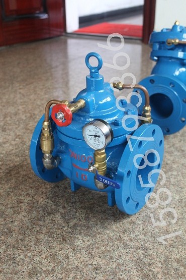 水力控制阀就是水压控制的阀门,它由一个主阀及其附设的导管﹑导阀﹑针阀﹑球阀和压力表等组成。根据使用目的﹑功能及场所的不同可演变成遥控浮球阀﹑减压阀﹑缓闭止回阀﹑流量控制阀﹑泄压阀﹑水力电动控制阀等。水力控制阀分隔膜型和活塞型两类,工作原理相同,都是以上下游压力差△P为动力,由导阀控制,使隔膜(活塞)液压式差动操作,完全由水力自动调节,从而使主阀阀盘完全开启或完全关闭或处于调节状态。当进入隔膜(活塞)上方控制室内的压力水被排到大气或下游低压区时,作用在阀盘底部和隔膜下方的压力值就大于上方的压力值,所以将主阀阀盘推到完全开启的位置;当进入隔膜(活塞)上方控制室内的压力水不能排到大气或下游低压区时,作用在隔膜(活塞)上方的压力值就大于下方的压力值,所以就会把主阀阀盘压到完全关闭的位置;当隔膜(活塞)上方控制室内的压力值处于入口压力与出口压力中间时,主阀阀盘就处于调节状态,其调节位置取决于导管系统中的针阀和可调导阀的联合控制作用。可调导阀可以通过下游的出口压力并随它的变化而开大或关小其自身的小阀口,从而改变隔膜(活塞)上方控制室的压力值,控制方阀阀盘的调节位置。