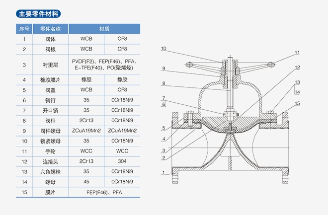 1、复合隔膜将阀体下部内腔与阀盖内腔隔开,并与之形成直流通道,使隔膜上部的阀杆、阀瓣等内件与介质完全隔离,省去填料密封结构,介质的内漏和外漏可同时避免。 2、利用FEP( Teflon)氟塑料与合成橡胶复合而成的隔膜和带有Teflon氟塑料衬里层的阀门,可适于除“熔融碱金属、元素氟”外的各种强腐蚀性介质。