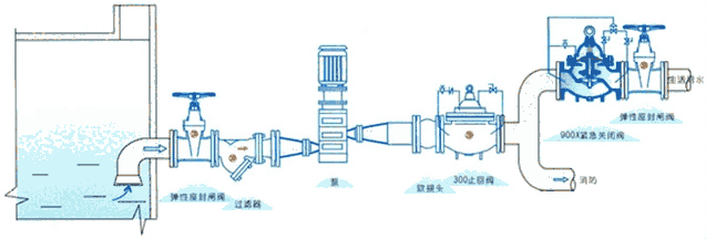 当消防泵起动,或变频泵压力升高,超过导阀设定压力时,由主阀入口通向导阀控制管压力升高,作用在弹簧上的压力增大,向下压紧,带动阀芯下移,使导阀封闭,此时主阀入口压力通过节流阀不断增补到主阀阀盖上腔,因阀瓣受到的向下的压力大于向上的推力,主阀封闭。