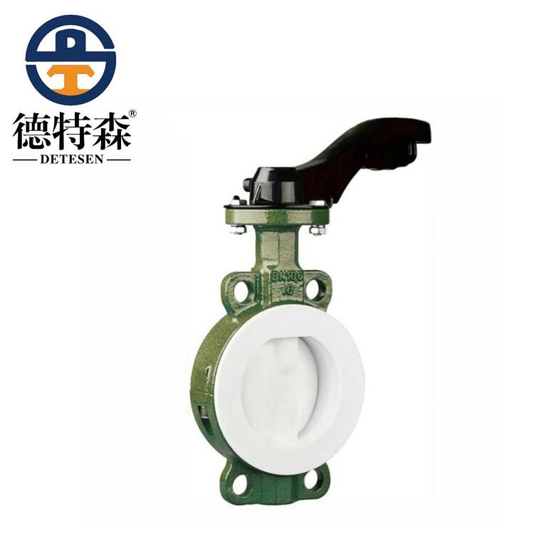 D71F46手柄对夹式衬氟蝶阀适用于温度≤120℃,公称压力≤1.6MPa的食品、医药、化工、石油、电力、轻纺造纸等给排水、气体管道上作调节流量和截断介质的作用,适用于各种浓度的王水、硫酸、盐酸和各种有机酸、强酸、强氧化剂等介质。