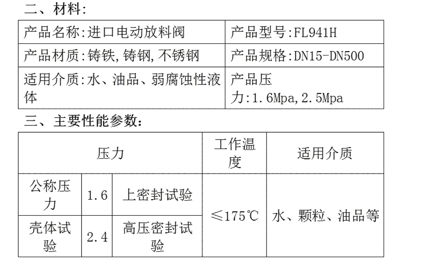 FL941H进口电动放料阀适用介质如水、丙酮、酒精、氨、碳酸钡、苯(WCB材质的低用温度为-29℃,温度为425℃。),电动放料阀使用介质如颗粒、油品、纸浆、二氧化碳、气(不锈钢材质的低使用温度为-100℃,使用温度为232℃。),电动放料阀严禁使用含氟离子液体(如HF等)也不能用强碱及磷酸(温度>150℃浓度>30%)。