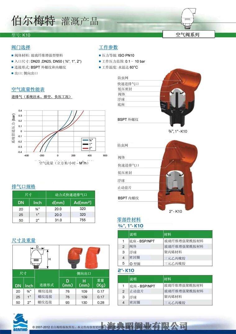 K10 是一款高品质动力式快速进排气阀,适用于各种灌溉系统应用场合和工况。系统注水时,空气阀排出管道中大量空气;系统排空时,空气阀吸入大量空气。W阀门采用符合气体动力学的先进设计,具有动力式快速进排气口;可避免空气积聚,防止形成负压,低压时具有良好的密封性能。