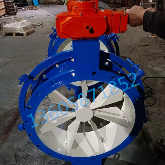 6、数个挡板叶片转动呈“八”形相对方向开启或关闭,开度和流量呈线性调节。