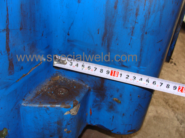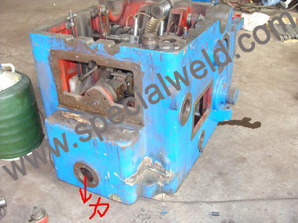 焊接难点:压机吨位大,机座部位被拉裂,而机座箱体内有齿轮润滑油,箱体拉裂不光是要解决大吨位的受力问题,并且要解决焊后的密封问题。
