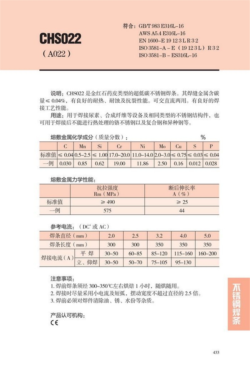 CHS422 不锈钢焊条 大西洋Cr25Ni18Mn8电焊条 四川大西洋 CHS022 焊条 E316L-16 不锈钢焊条 A022电焊条A022 E316L-16铬钢通常为改善耐蚀性及可焊性而加适量的稳定化元素钛、铌、钼,可焊性较铬13钢为好,可采用同类型的铬不锈纲焊条(CHK302、CHK307)焊接。焊前,焊件应进行200℃左右预热,焊后进行800℃左右的回火处理。也可采用铬镍不锈钢焊条(如CHS107、CHS207),焊后不进行热处理。E316L-16 钛钙型的碳Cr18Ni12Mo2不锈钢焊条,具有良好的耐热、耐腐蚀及抗裂性,可直交流两用,工艺性能好。用于尿素、合成纤维等设备及相同类型的不锈钢,也用于焊后不热处理的鉻不锈钢、复合钢和异种钢等