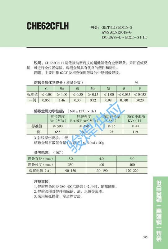 说明:CHE62CFLH是低氢钠型药皮的超低氢低合金钢焊条。采用直流反接,可进行全位置焊接。焊缝金属具有良好的塑性和韧性。