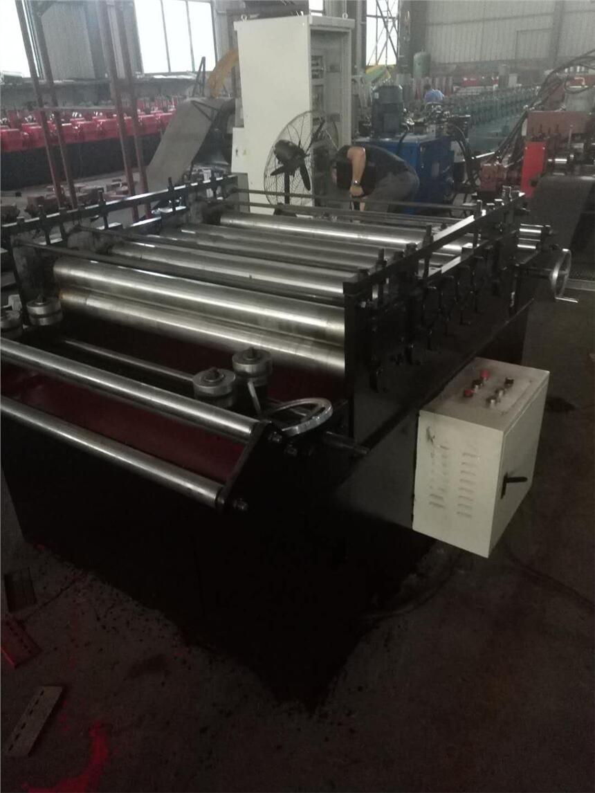 b. 功能与结构:将冲压切断后的板料经26~30道次的辊轮,逐渐辊压成成品桥架。由变频电机、减速机、高精度滚动直线导轨、左右传动箱、横向调整机构、辊轮组组成。一组辊轮可完成所有规格的桥架成型,更换品种可通过调整左右辊架位置实现。床身及传动箱采用焊接结构,去应力处理;齿轮采用45钢硬齿面;