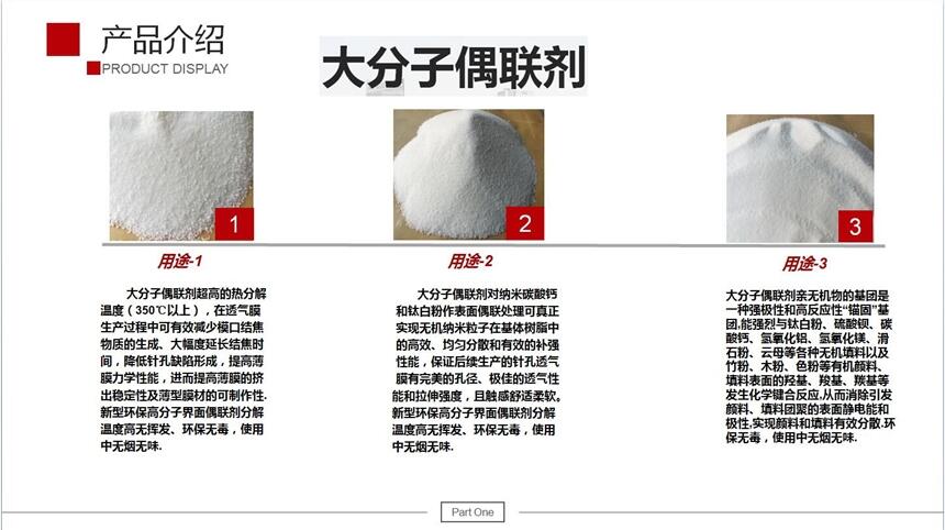 一、MCA-1 透气粒子专用偶联剂是华南理工大学材料科学与工程学院联合研制的、专门针对卫材用透气粒子生产加工过程中纳米碳酸钙和钛白易团聚难分散这一难题研发的新型环保高分子界面偶联剂。