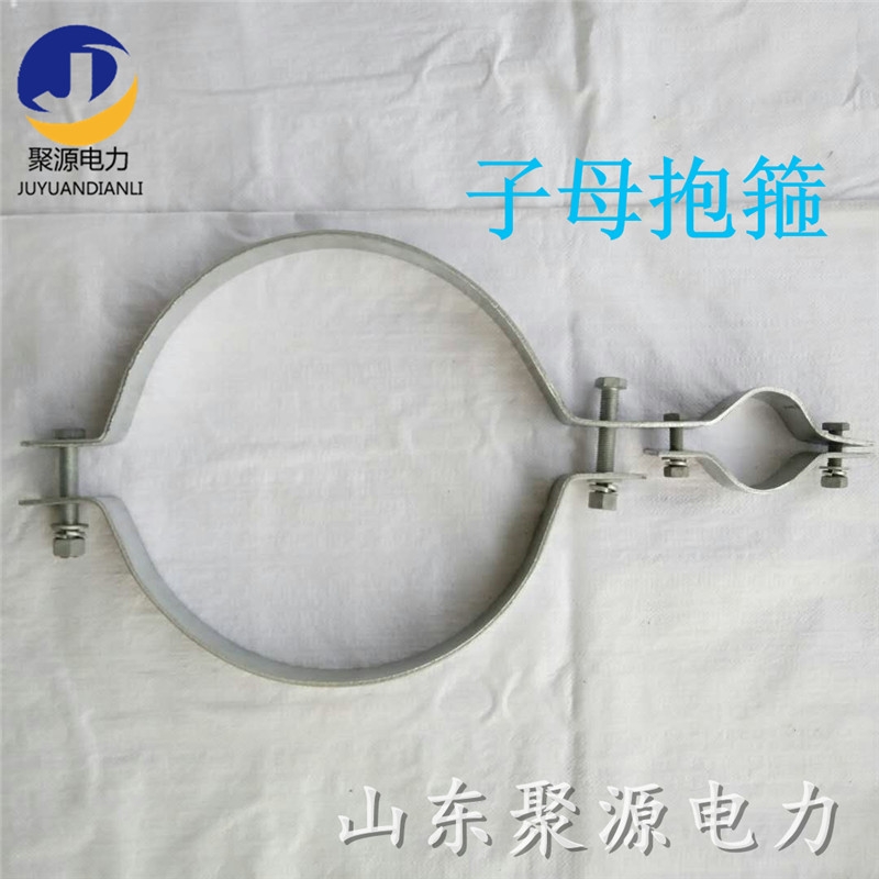所谓抱箍是用一种材料抱住或箍住另外一种材料的构件,它属于紧固件.子母抱箍则适用于一个大抱箍安装在电线杆上面,另外一个小抱箍抱住光缆保护管的一种组合抱箍,材质是使用优质4*40的钢板,表面进行热镀锌处理,订货时需要提供线杆的杆径和光缆保护管的直径,才能定做。