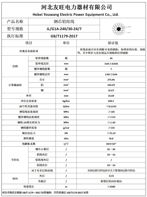 四、240/30钢芯铝绞线厂家产品基本参数及样本图片: