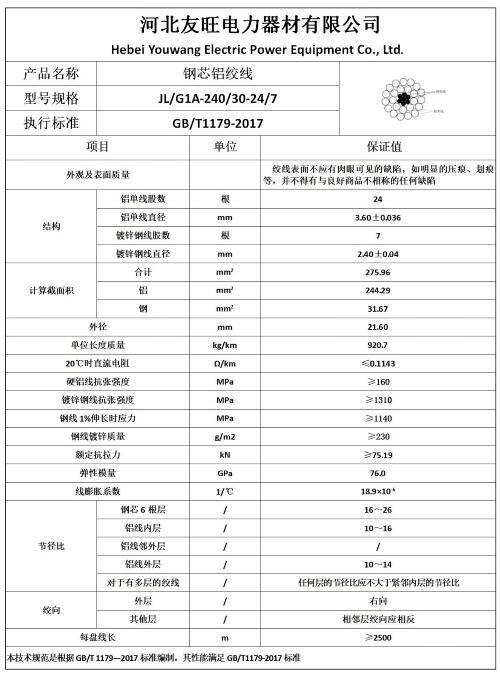 四、国标钢芯铝绞线JL/G1A240/30现货供应产品基本参数及样本图片: