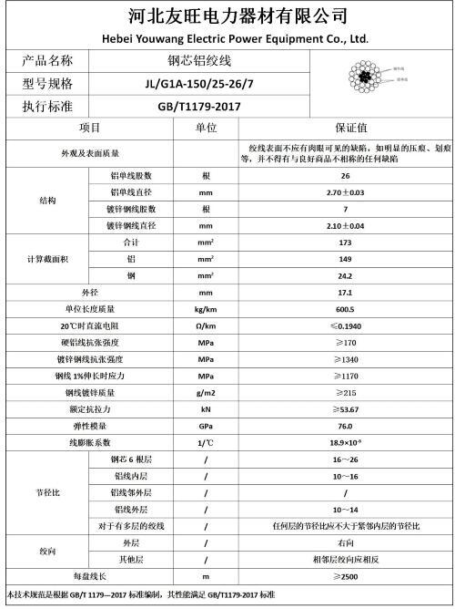 四、国标钢芯铝绞线JL/G1A150/25现货供应产品基本参数及样本图片: