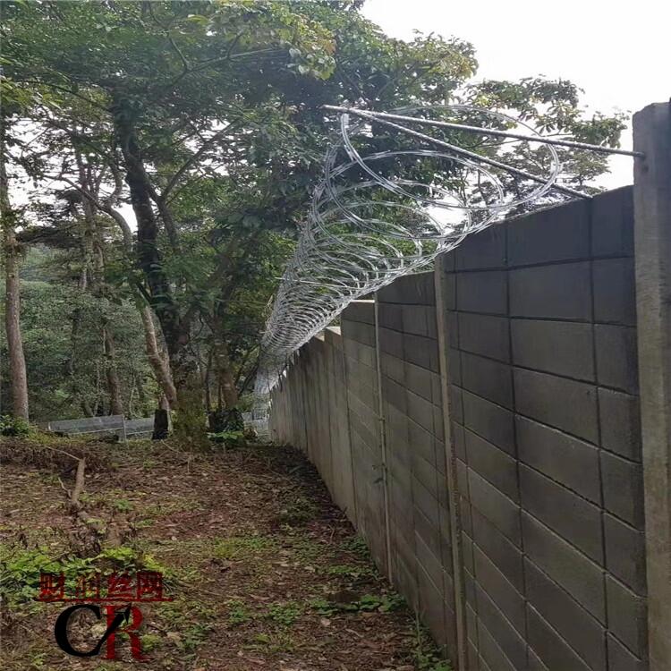 围墙刀片刺绳由于鳃网形状独特,不易接触,可达到良好的防护隔离效果。围墙刀片刺绳产品的主要材料为镀锌钢板和不锈钢板。围墙刀片刺绳:喷雾塑料刀片刺网(PVC刀片刺网,涂层塑料刀片刺网),又称喷雾塑料刀片刺绳,围墙刀片刺绳是由刀片刺绳后产生的刀片刺绳制成的。喷涂表面处理使其具有较好的防腐能力、表面光泽度好、防水效果好、施工方便、经济实用等优良特性。
