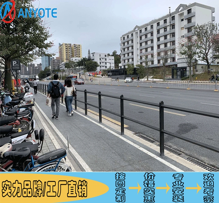 市政铁艺护栏特点:具有轻盈、美观、实用;网片与网柱连接十分紧凑,整体感好;隔离性能好,底座使用水泥墩