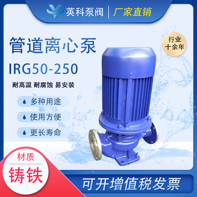 立式管道离心泵IRG50-250热水管道泵11KW单级铸铁12.5m3/h英科牌 泵轴位置 | 立式 | ||