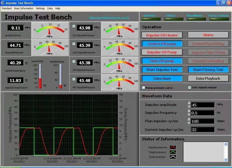 3. 电器控制柜及计算机测试系统:启动按钮和仪表均安装在操纵台上,便于集中控制和监测情况,计算机系统采用美国NILabView测控软件,可以采集试验压力波形、试验次数、脉冲频率等参数且具备报表打印功能,并有故障通告功能。