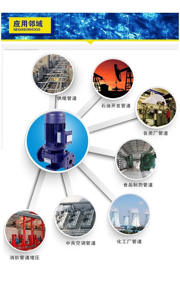 7. ISGD、IRGD、GRGD、IHGH、YGD、IHGBD型立式低速管道离心泵,适用于环境噪声要求很低的场合及空调循环等。