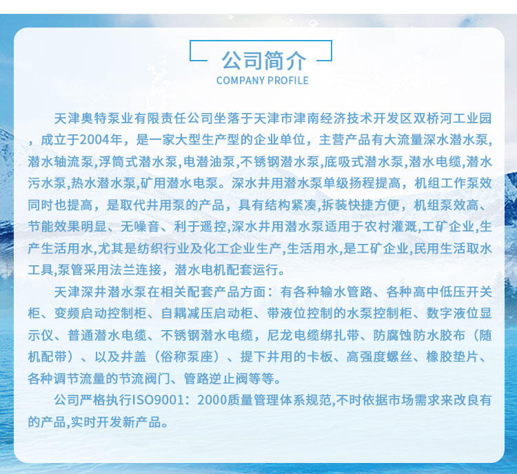 四、是要仔细查看厂家是否取得了出产许可证。可通过向经销商查询和查看说明书、包装物等断定出产厂家是否有出产许可证。如无,则是不合法出产,其产品质量不牢靠,不要购买。五、是要依据扬程挑选潜水泵。依据水位距地面的高度来断定和挑选潜水泵的扬程。国家规范规则,潜水泵运用的安全扬程应在规则扬程的83%~140%之间。
