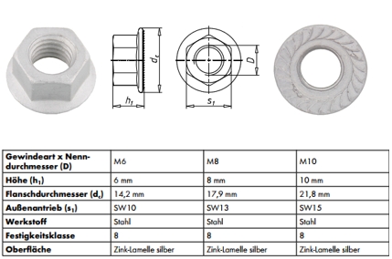 3、货号: Similar to DIN6923, 材质:ST-8, 涂覆表面:本色、镀锌、VZD、GEO规格:M6-M12