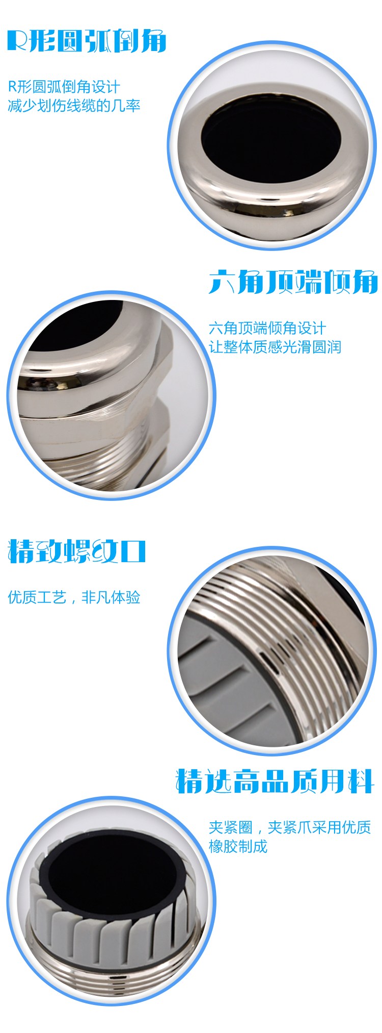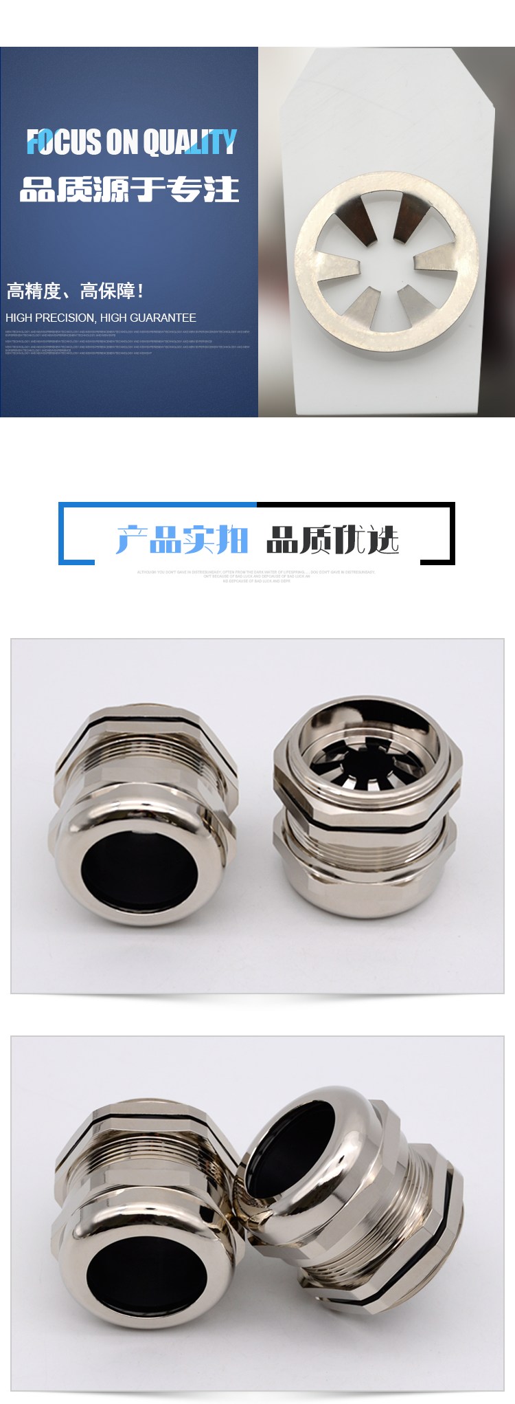 產品說明 :采用黄铜材质精制而成,内置隔爆装置,具有独特的防爆功能,另有特殊夹紧爪与夹紧圈之设计,夹紧电缆范围大,抗拉力特强,可防水、防尘、抗盐、耐弱酸、酒精、油、油脂及一般溶剂,电缆锁紧采用填料密封,防护性能好.具有快捷安装,安全可靠,防护性能好,防爆性能优越等特点。。