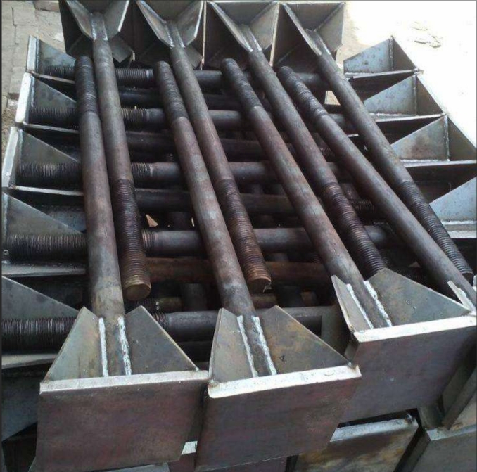 地脚螺栓一般用Q235钢,即为光圆的。螺纹钢(Q345)强度大,做螺母的丝扣没有光圆的容易。对于光圆地脚螺栓而言,埋深一般为其直径的25倍,然后做一个120mm左右长的90度弯钩。 如果螺栓直径很大(如45mm)埋深太深的话,可以在螺栓端部焊方板,即做一个大头就可以了(不过也是有一定要求的)。埋深和弯钩都是为了保证螺栓与基础的摩擦力,不至于使螺栓发生拔出破坏。