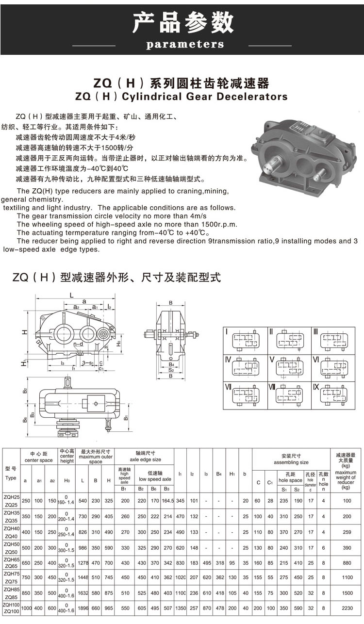 ZQA500圆柱齿轮减速机为中硬齿面减速器,是在ZQ型减速机基础上改进的产品,改变其齿轮,齿轴材质,和加工工艺,用35CrMo和42CrMo制作齿轮齿轴,调质处理,增加硬度,承载能力大大提高。又便于替代ZQ型减速器。