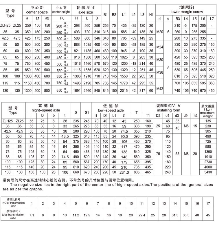 齿轮减速机是按国家专业标准ZBJ19004生产的外啮合渐开线斜齿圆柱齿轮减速机,一般用于低转速大扭矩的传动设备,把电动机普通的减速机也会有几对相同原理齿轮达到理想的减速效果,大小齿轮的齿数之比,就是传动比。ZL115-22.4-III齿轮减速器为双级传动,软齿面产品,减速机采用460#中负荷工业齿轮油,工作环境温度为0~40℃。在运转200~300小时后,应进行换油,在以后的使用中应定期检查油的质量,对于混入杂质或变质的油须及时更换。一般情况下,对于长期连续工作的减速机,按运行5000小时或每年一次更换新油,长期停用的减速机,在重新运转之前亦应更换新油。ZL115减速机应加入与原来牌号相同的油,不得与不同牌号的油相混用,牌号相同而粘度不同的油允许混合使用;