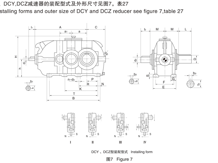 DCY315齿轮减速机各传动比型号:DCY315-16,DCY315-18,DCY315-20,DCY315-22。4,DCY315-25,DCY315-28,DCY315--31。5,DCY315-35。5,DCY315-40,DCY315-45,DCY315-50,每一传动比有四种装配型式,两种旋转方向,组合成上百种型号供各行业选择。