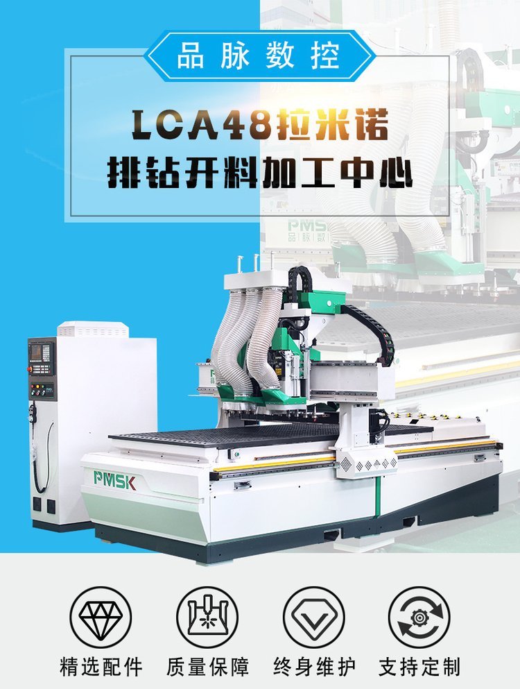 LDA-1325拉米诺数控排钻开料加工中心,主要用于板式家具生产的钻孔、铣槽、切割加工和橱柜门板的雕刻、铣形加工。这款机器配置了9KW自动换刀主轴和大容量刀库,可以解决各种复杂生产工序,同时机器还配置了排钻组和四轴锯,能够高效率解决板式家具三合一、二合一连接件所需安装孔及拉米诺、木得易、U型扣等隐形连接件所需安装槽,是目前所有开料机机型中功能全面,效率极高的一款机型。