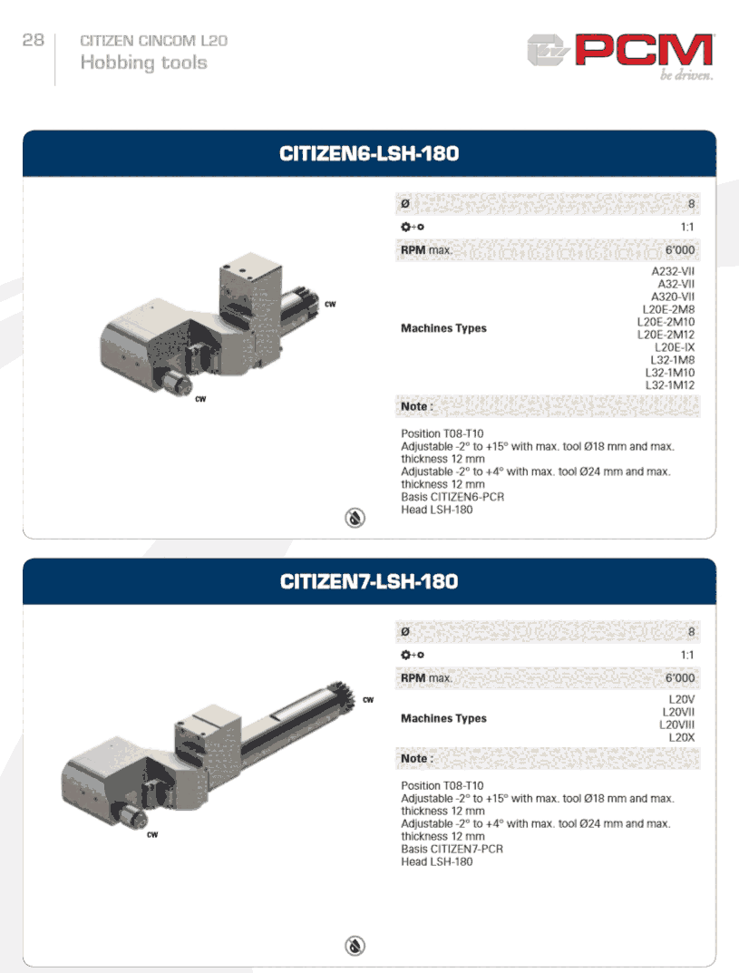 瑞士PCM设计的动力刀座已经普遍的被TUSGAMI (津上),TORNOS,CITIZEN(西铁城),STAR (星牌),HANWA(韩华)等机床广泛使用 - 高转速、高精度、长寿命。提高加工效率