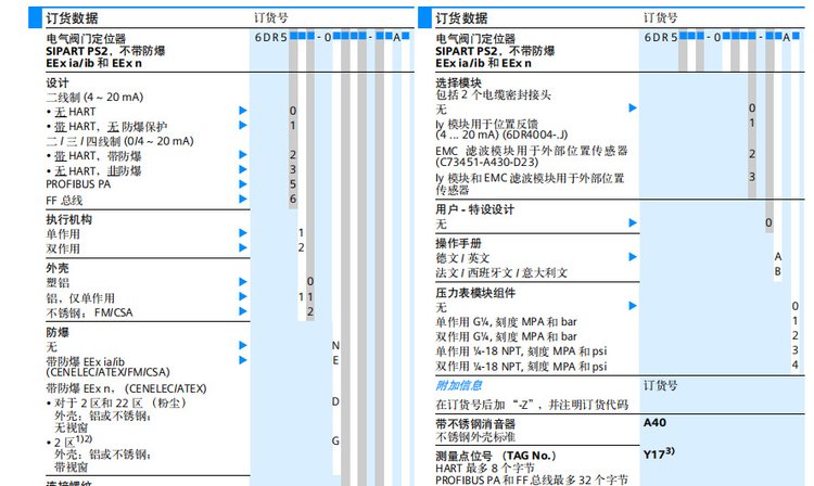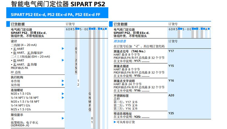 温馨提示 为避免给您带来不必要的麻烦,请您在联系卖家确认价格与货期后再拍下宝贝!!! 请各位淘友在拍下商品后,如有需要修改地址的,请及时与店家联系,以便尽快发货!!! 咨询电话: 15800920638 西门子智能电器阀门定 位器 SIPART PS2系列 6DR5010-0NG00-0AA0 (单作用,普通型) 6DR5010-0N N 00-0AA0 (单作用,普通型) 6DR5010-0EG00-0AA0 (单作用,本安型) 6DR5010-0E N 00-0AA0 (单作用,本安型) 6DR5110-0NG00-0AA0 (单作用,HART ,普通型) 6DR5110-0N N 00-0AA0 (单作用,HART ,普通型) 6DR5210-0EG00-0AA0 (单作用,HART ,本安型) 6DR5210-0E N 00-0AA0 (单作用,HART ,本安型) 6DR5015-0EG00-0AA0 (单作用,隔爆型) 6DR5015-0E N 00-0AA0 (单作用,隔爆型) 6DR5020-0NG00-0AA0 (双作用,普通型) 6DR5020-0N N 00-0AA0 (双作用,普通型) 6DR5020-0EG00-0AA0 (双作用,本安型) 6DR5020-0E N 00-0AA0 (双作用,本安型) 6DR5120-0NG00-0AA0 (双作用,HART,普通型) 6DR5120-0N N 00-0AA0 (双作用,HART ,普通型) 6DR5220-0EG00-0AA0 (双作用,HART ,本安型) 6DR5220-0E N 00-0AA0 (双作用,HART ,本安型) 6DR5025-0EG00-0AA0 (双作用,隔爆型) 6DR5025-0E N 00-0AA0 (双作用,隔爆型) 6DR4004-8J (4-20mA 信号反馈,普通型) 6DR4004-6J (4-20mA 信号反馈,本安型) SM6DR4004-1M (单作用压力表组件) SM6DR4004-2M (双作用压力表组件) SM6DR4004-8VL、8VK、8D (直行程、角行程反馈组件) 角行程支架 (需提供安装尺寸) 直行程支架 (需提供安装尺寸)
