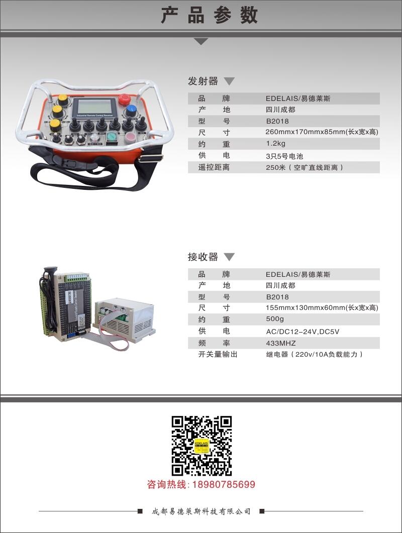 主要经营:工业遥控器,工业无线遥控器,起重机遥控器,行车无线遥控器,天车无线遥控器,塔吊无线遥控器,架桥机无线遥控器,履带车无线遥控器,AGV小车无线遥控器,机器人小车无线遥控器,电动葫芦遥控器,防爆无线遥控器,工程车辆遥控器,石材切割机无线遥控器,碎石机无线遥控器,破碎机无线遥控器,环卫车无线遥控器,垃圾车无线遥控器,舞台车无线遥控器,挖掘机无线遥控器,无人船无线遥控器,选号无线遥控器,掘进机无线遥控器,卷扬机无线遥控器,升降机无线遥控器,电焊机无线遥控器,布料机无线遥控器,混凝土泵车无线遥控器,微耕机无线遥控器,农药喷雾车无线遥控器,垃圾清理车无线遥控器、消防车无线遥控器、消防机器人遥控器、视频无线遥控器、液晶屏无线遥控器、双工双向遥控器、提梁机无线遥控器、矿山机械无线遥控器等.
