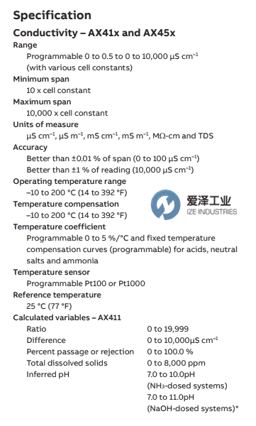 AX400分析仪采用了新技术,可提供高度可靠,灵活,功能丰富的设备,可满足各种过程监控应用需求。完整的范围包括pH /氧化还原(ORP),电导率和溶解氧的解决方案。 AX41x和AX45x型号可同时测量一个或两个低电平电导率点,同时进行本地显示和重新传输。 该分析仪与ABB 2电极电导率电池一起使用,可提供卓越的准确性和性能测量。