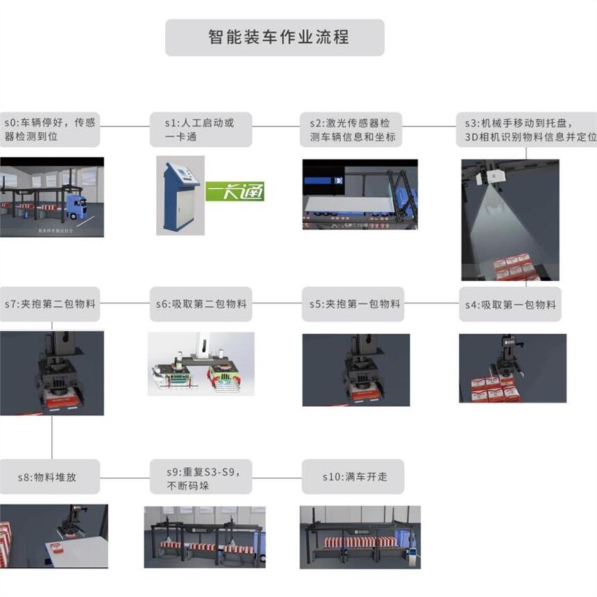 用自动化设备替代人工实现自动装车,此设备的导入能够节省人力提高生产效率及降低劳动强度。项目方案以桁架机器人、3D视觉传感器和激光传感器为主体,通过自动装车系统把各个作业工序连接起来,袋装无人自动装车系统很好实现了本项目的所有功能要求