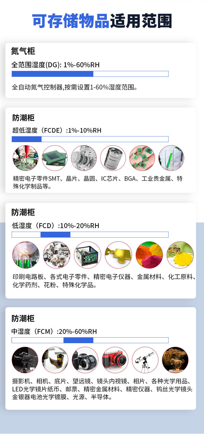 要想选择出合适的存储设备,得充分考虑存储物品的特质和设备自身性能。随着技术的发展,已经研发出超低湿款防潮箱,湿度1-60%RH可设值,低湿能够达到5%RH以下,除湿速度快,同样也可以达到很好的防氧化作用。未来防潮箱、氮气柜、干燥柜行业需要提高生产制造能力,加大研发和创新投入,搭上互联网快车,拓宽智能化市场空间。