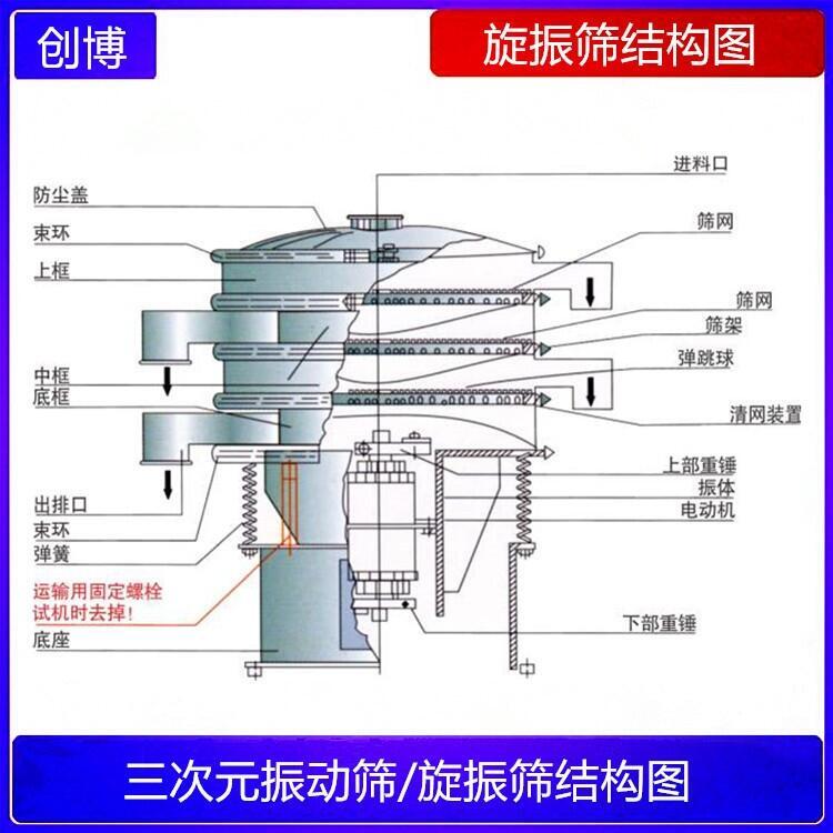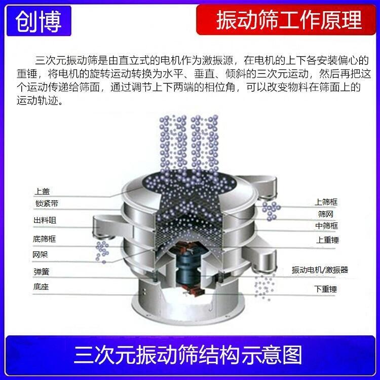 结构特点:1、接触物料部分全部采用进口304不锈钢制造,清洗方便,振动筛不会对物料产生机械污染;2、筛机设计独特,一人即可操作,筛机换网方便,仅需3-5分钟可换下筛网:3、采用先进的弧面筛网设计,有效筛面面积增大、筛分效率高;4、振动筛可单层使用,也可多层使用,同时筛分出不同颗粒;5、筛网采用进口高强度网丝作为母线,长1使用振动筛不变形,不磨损,使用寿命长,生产成本低;6、振动筛筛网网孔均匀,独特防静电设计,长时间工作振动筛网孔不堵塞。7、振动筛筛网结合部高度密封,振动筛工作时粉末不飞扬,不浪费物料,不污染环境8、振动筛同粒级物料分口出料,装袋方便。9、振动筛在振动筛中特置适量振动球,有效解决物料沾附、堵塞筛网问题,成倍提高筛分效率。