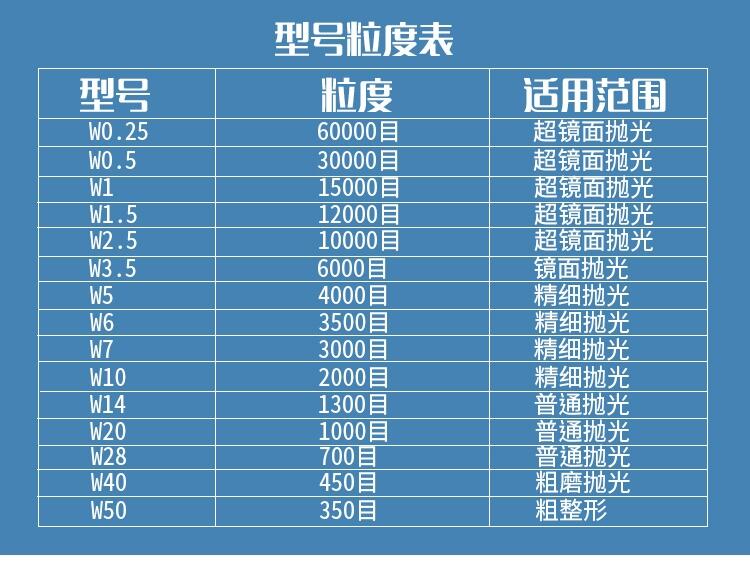 精选级:选用优质金刚石颗粒为原料,微粉经过二次筛选,晶型更完整,抗冲击强度高,产品稳定性强,韧性好。