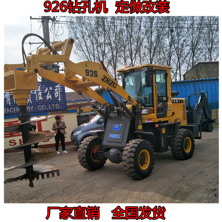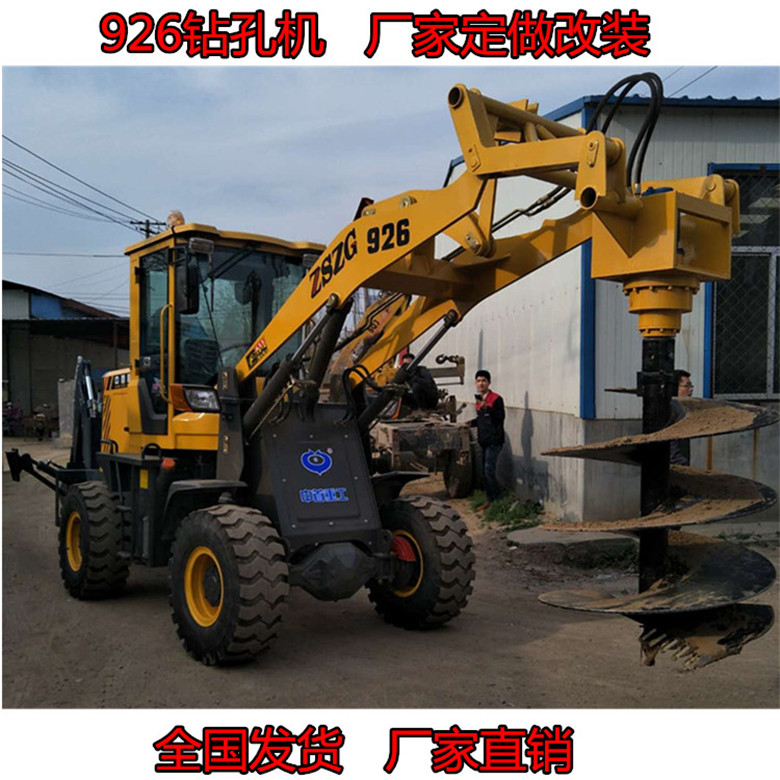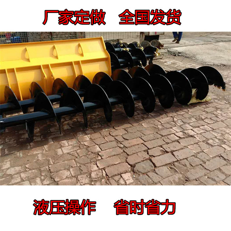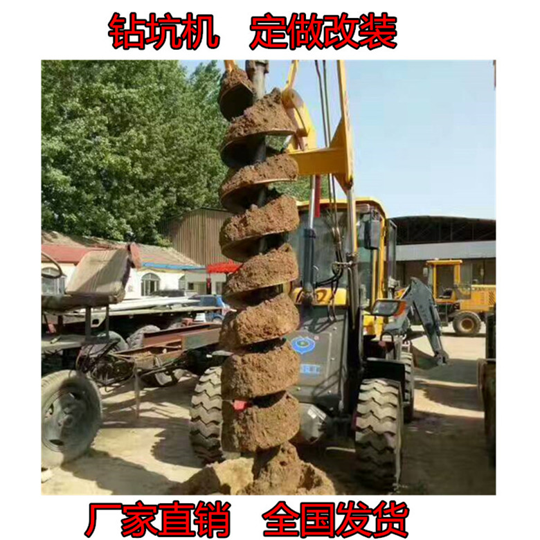 操作方面还至少需要2个人完成,一个人操作机器,一个人完成清土工作。本机采用50或65拖拉机,马力大,动力充沛。钻孔无需清土,一个人即可完成工作,钻到深度后,可靠两条油缸将钻杆提起,土都附着在螺旋叶片上,很少有回落。提起后只需将钻杆正反转动记下土就会自然落下。挖掘机打孔机 挖掘机改钻孔机装打孔机可以实现单人操作,车到孔成,随钻随走。大大提高工作效率。钻孔机|钻树坑装载机全国发货青海