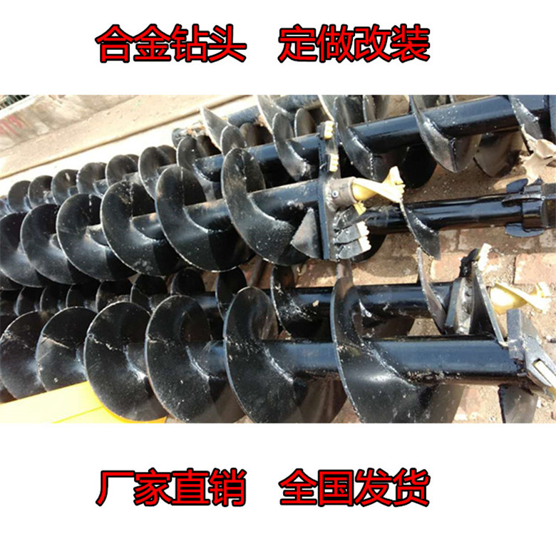 挖掘机打孔机 挖掘机改钻孔机装打孔机基本结构: 超高压液压泵与拖拉机输出轴连接,为整个液压系统提供动力,包括液压油缸,液压马达等等。螺旋叶片的转动是依靠液压马达带动,每分钟100转左右,钻杆的起落是通过两条主油缸控制,再钻孔前端马达上方有两条调节油缸用来钻孔时的校直钻杆的垂直度。标准钻杆直径为500mm,长度为3米,钻杆可以定做从直径200mm-直径800mm,长度可达到4.2米。螺旋叶片标准为8mm厚,特殊要求可定做。土质中如有鹅卵石不影响钻孔,以为螺旋叶片可以将馒头大时候旋出土面,沙硕层中如土的含量大于25%就可以钻孔。钻孔机|钻树坑装载机全国发货青海