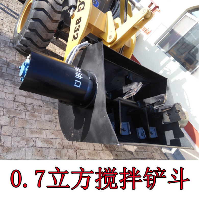 一是定做搅拌铲斗利用一台装载机把铲斗部位拆除,安装上铲斗式搅拌缸及其配套系统就是一台装载机铲斗式混凝土搅拌机,实现自行上料、拌合、 转场、卸料功能。