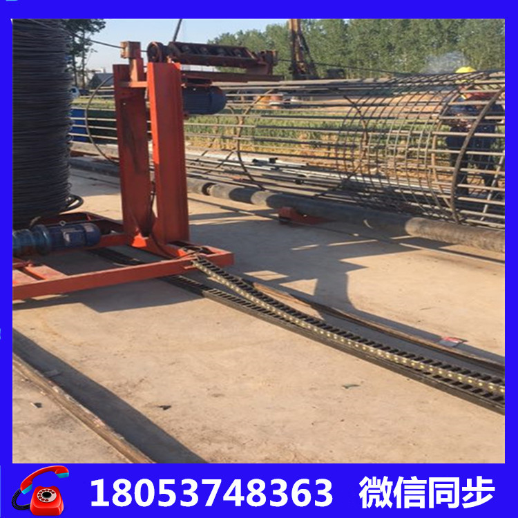胶辊旋转带动钢筋笼转动,按图纸设计间距,配合小车移动缠绕箍筋成型。