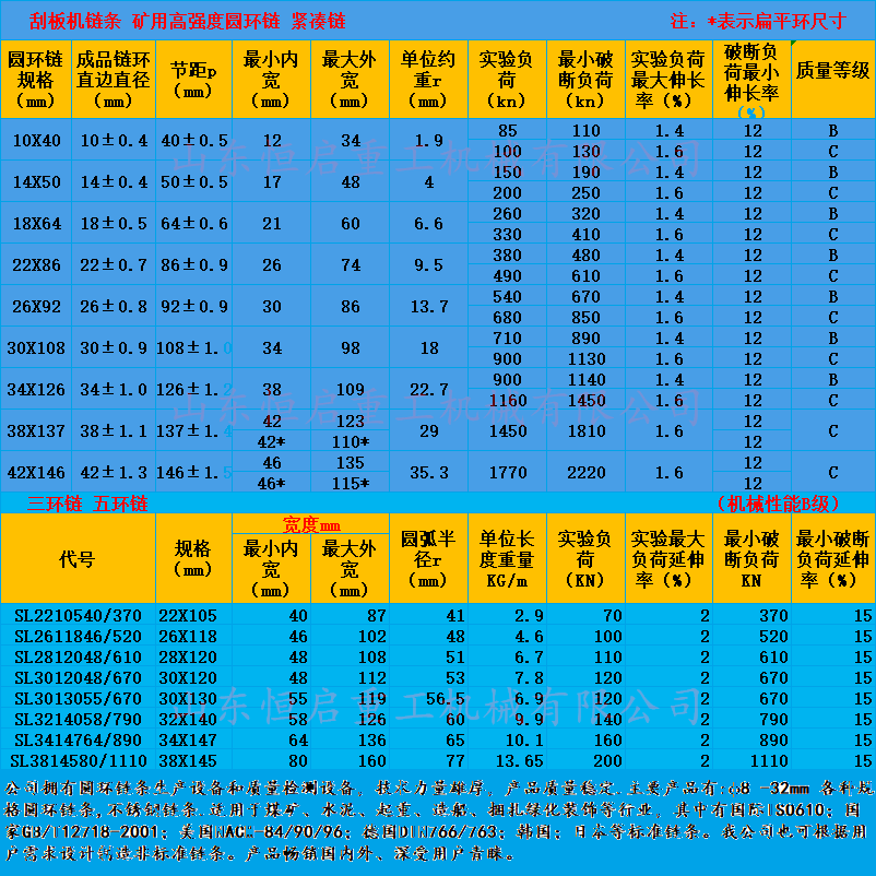 圆环链规格(mm):10X40、14X50、18X64、22X86、26X92、30X108、34X126、38X137、42X146、48X152具有高强度、高韧性、耐磨损、耐腐蚀的特点广泛应用于刮板运输机上的传动链。