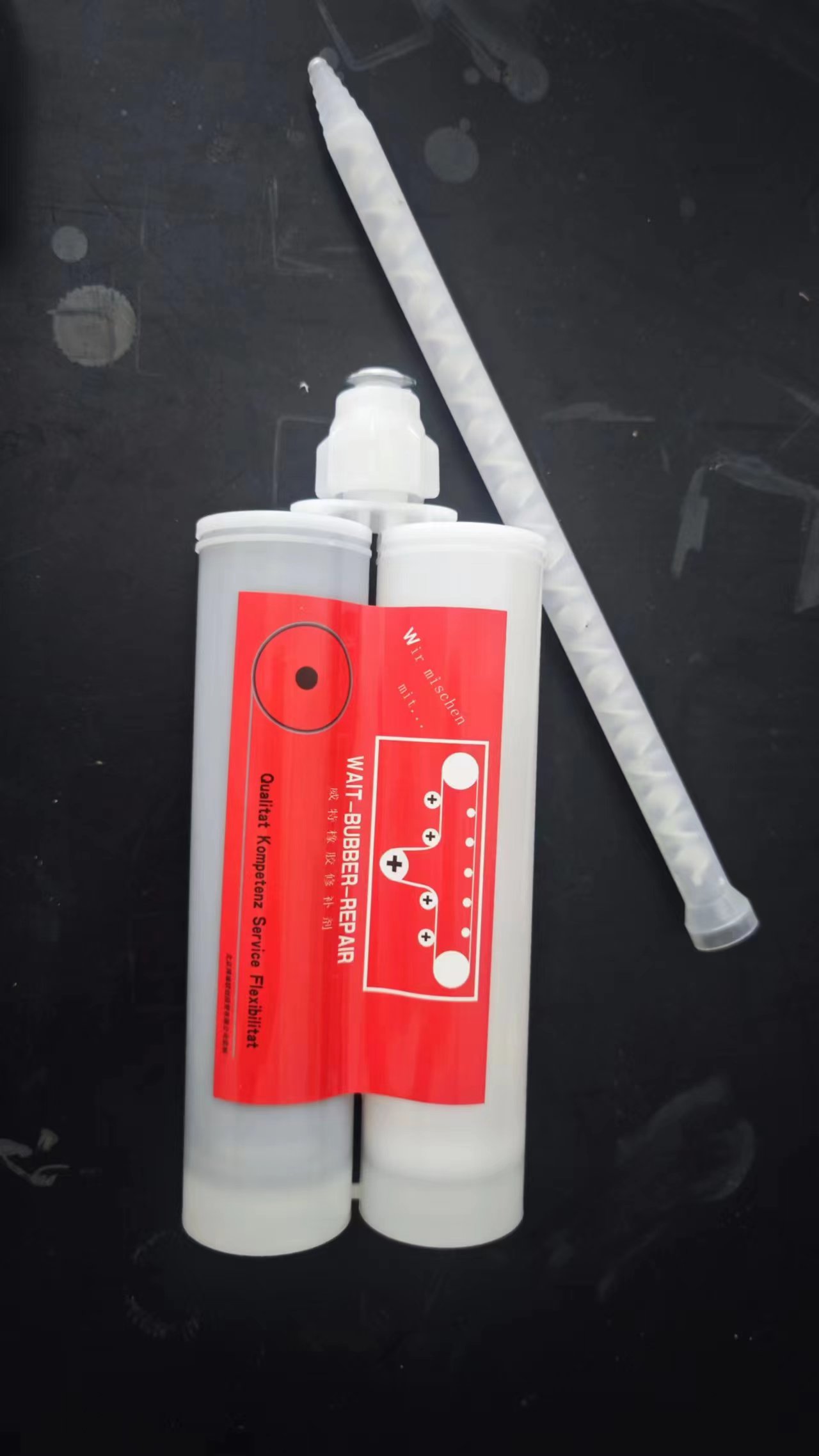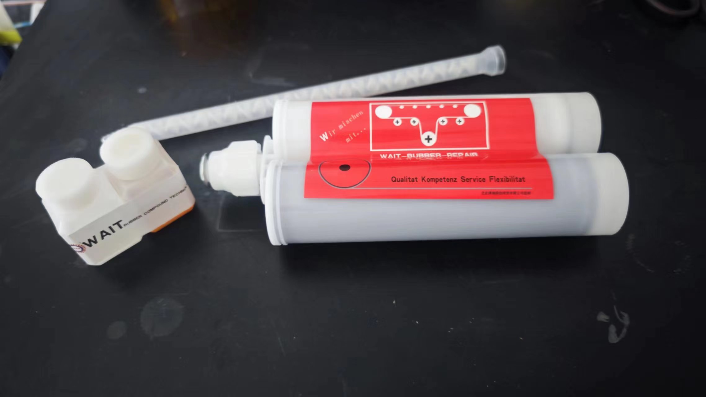 威特高强度高粘接橡胶修补剂为四组份材料,基料与固化剂AB组份混合均匀后,快速反应实现交联快速固化,粘接底胶AB组份混合后,形成粘接层。混合后的修补剂与混合后的粘剂底胶结合后能够与橡胶形成超强结合体,可适用于橡胶输送带、履带、辊、罐滚筒包胶密封橡胶制品破损等橡胶制品的快速修补。