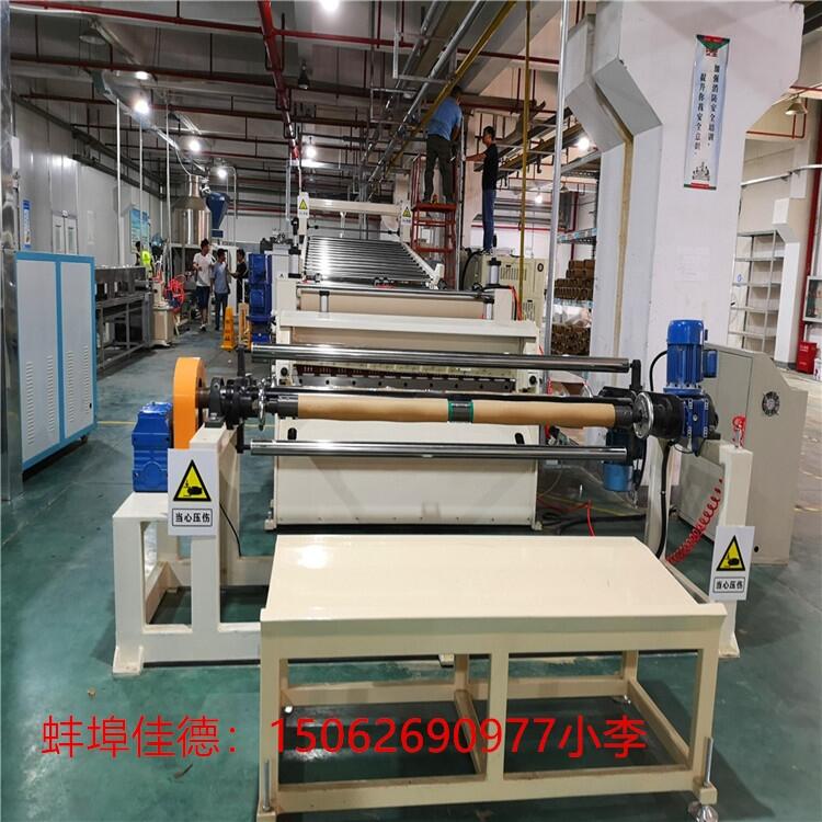 M密炼机→JDL自动提升机→JDL强制喂料机→JDL单螺杆→成型模具→三辊压光机→牵引机→板材电晕处理→切割机→堆放