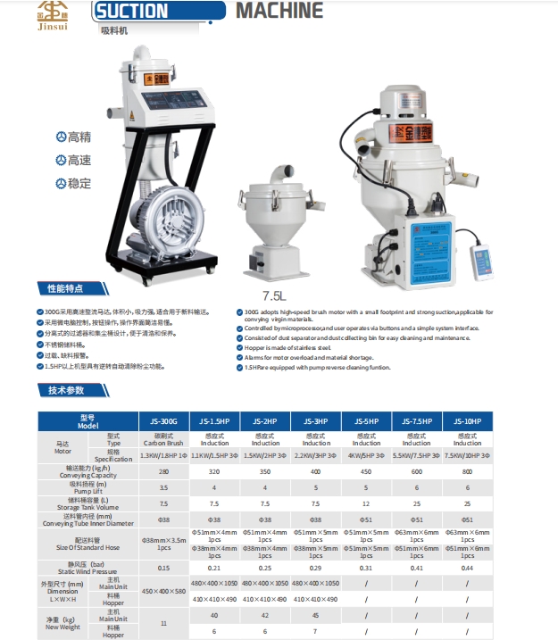 ·采用高速整流马达,体积小,吸力强,适合新料输送