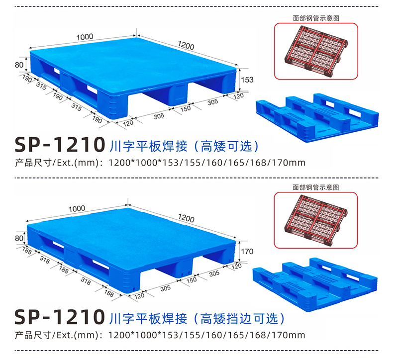 托盘在超出承重上作出了合理的设计,我们在托盘的承载面和腿部增加了钢管孔,在对超出托盘的承重下,我们可以选择添加钢管,根据客服的需要可添加3-8根钢管,大大增加了托盘的承重。温馨提示:在托盘需要上货架的情况下必须加钢管。