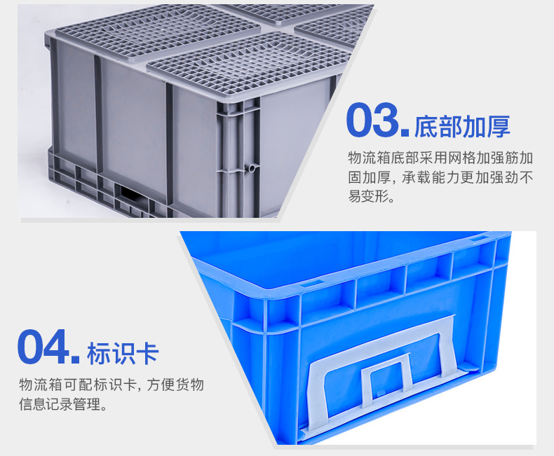 物流箱底部加厚设计,使箱底更耐磨损,不易变形,也增加了箱子的承载能力。箱体四周设计有logo区,客户在购买时可联系客服定制,或者客户可自行设计标识卡,方便货物信息记录管理。