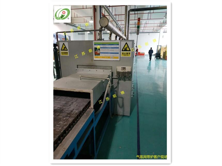 7、传动方式:采用机械传动的方式.由变频调速的电机,摆线针轮减速器、链轮、滚筒、托辊、挡轮、网带等组成。传动装置具有过载保护装置,防止网带因卡挂过载,而损坏网带。在炉体下部安装有张紧装置,通过弹簧调整张紧轮的压力,使网带保持一定的张紧力