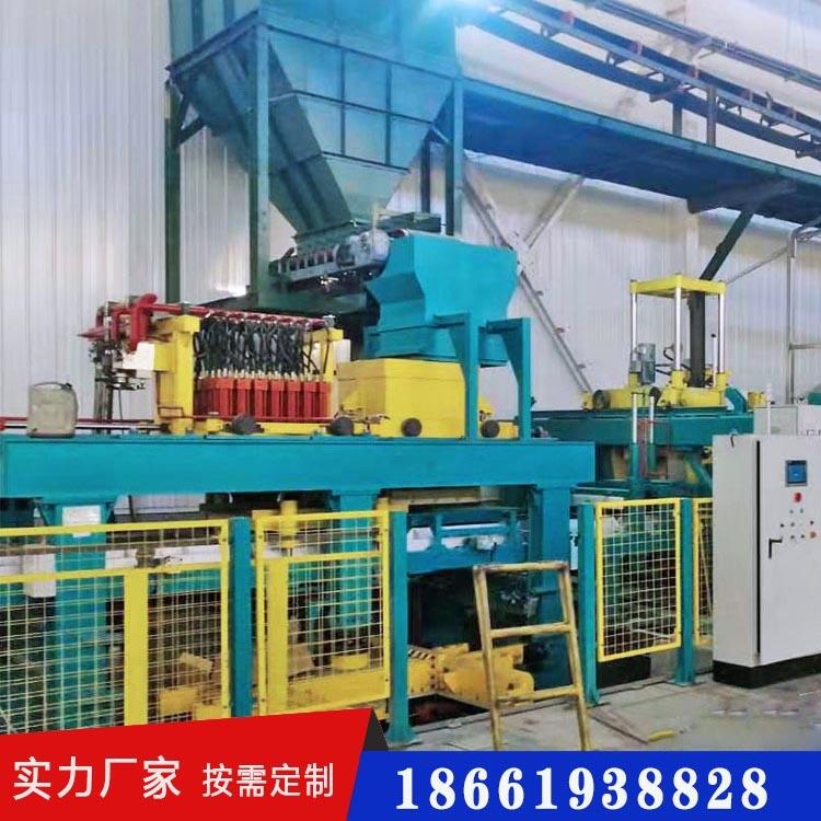 上箱加砂→压实→起模→推箱 →双箱翻箱→钻浇冒口→人工下芯→上箱翻箱→合箱→自动锁箱→人工浇注→自然冷却→捅箱落砂→自动分箱→自动上箱.