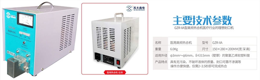苏州鑫电制造封血袋胶管的高频热合机(GZR-ⅡA)广泛用于医院、血库、中心血站即生物制品单位,特别适用于电压不稳的地区和乡镇外出采血。